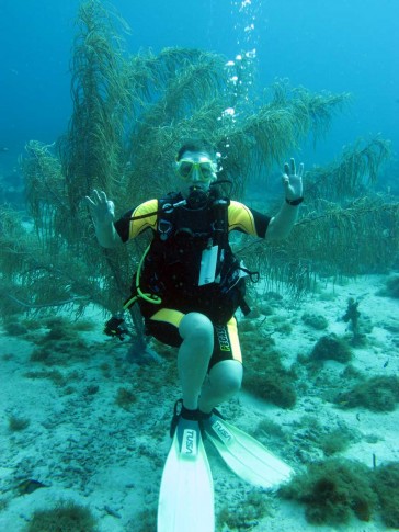 Vanmiddag de eerste duik gemaakt bij Mushroom Forest. Junior ‘Juny’ Obersi alias Captain Goodlife heeft ons er vanuit zijn paradijsje in de baai van Santa Cruz met de watertaxi naartoe gebracht. Althans, dat was de bedoeling…. hij was al even weg om mensen op te halen en kwam maar niet terug. Na een half uurtje was zijn vrouw het zat en bracht ze ons zelf weg met een ander bootje. Goed geregeld!
